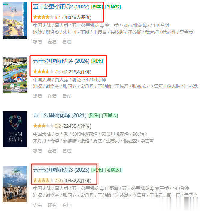 其实《五十公里桃花坞》第一季豆瓣评分刚过合格线。 可后头却是越作念越高。 第二季豆瓣高达8.1分,不雅看东谈主数也突飞猛进。 就连第三季和第四季,也踏着实了7.5分高下。